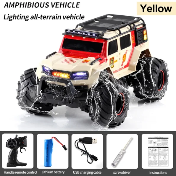 Amphibious off-road RC Cars:Whether indoors or outdoors, the amphibious stunt vehicle can easily conquer various terrains: like beach, swimming pool, land, stone road, beaches, and grasslands even in the water… Precisely sealed design makes it water and weather proof to conquer any extreme situation.It will offer an exciting and versatile experience for kids. Nice presents for kids ages 6 to 12./// The Remote is not waterproof !