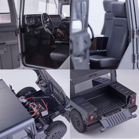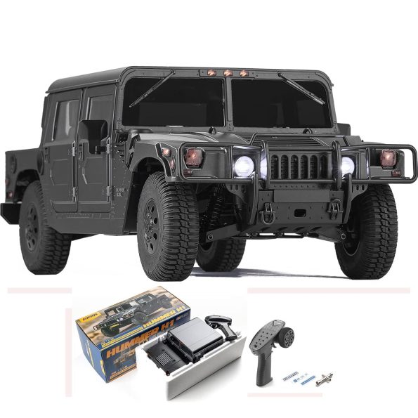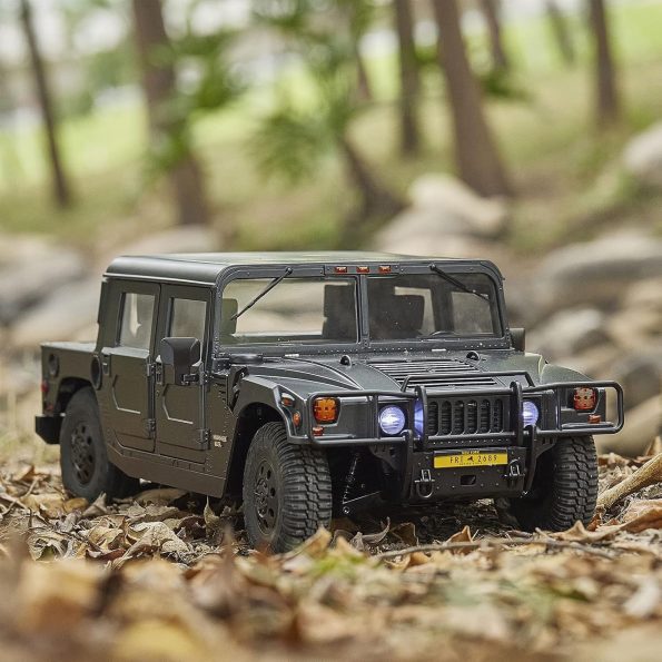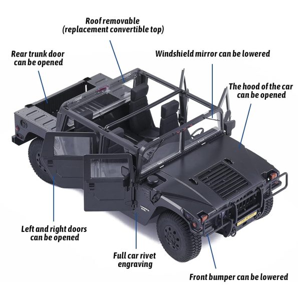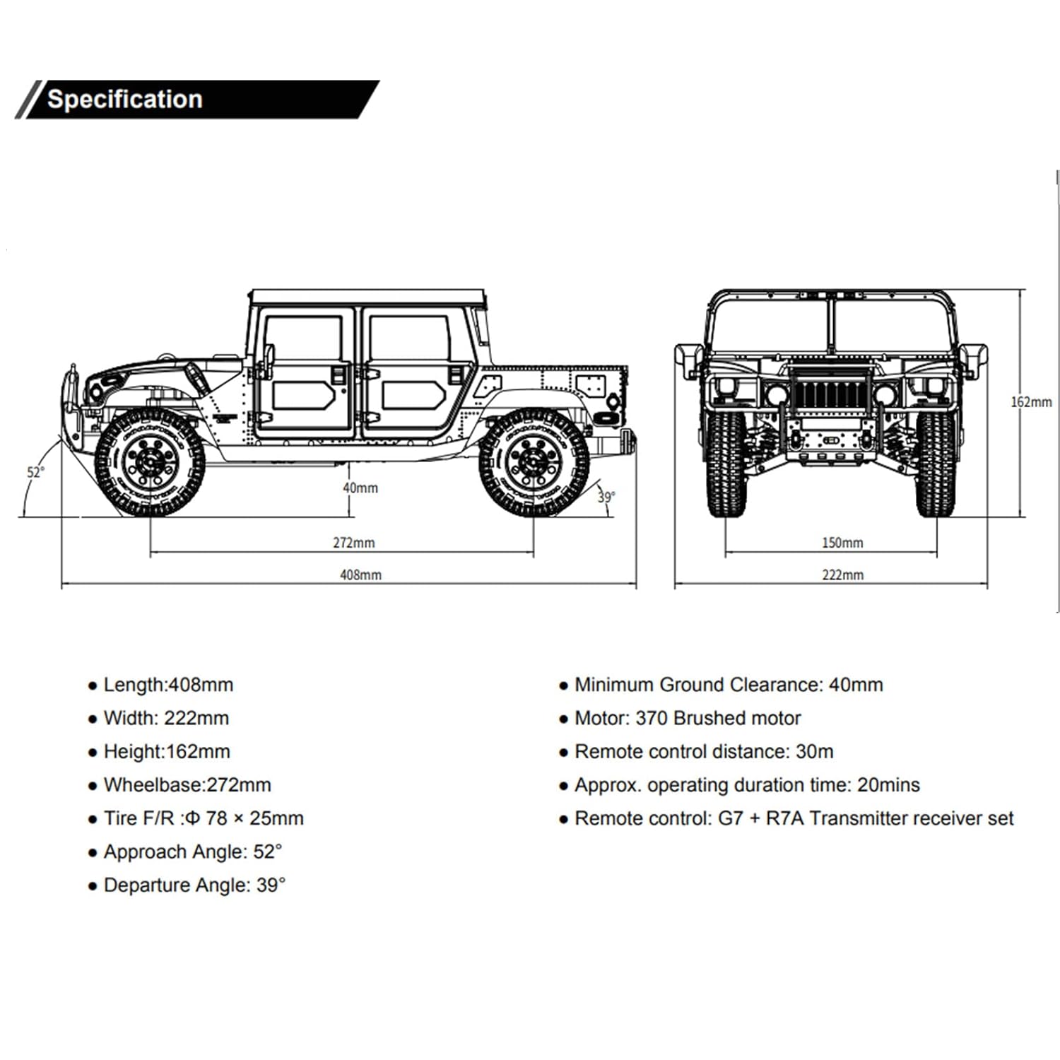 - The roof is removable and the windshield can be lowered forward. The body of the Hummer is mainly made of aluminum alloy and fiberglass, and the fixing method is riveting. A 2.4G 7CH digital proportional radio system, a receiver/ ESC/ light control three-in-one unit, 7 servos(including 13g metal gear servo x 2pcs)