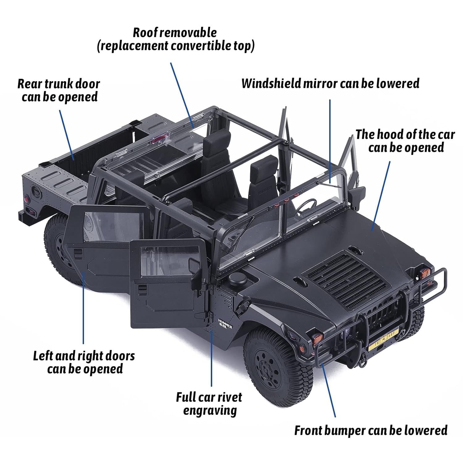 - The HUMMER H1 uses a front mid-engine layout just like the real vehicle, and the hood is designed to be flipped forward. Four doors can all be opened, and the smart door lock mechanism is a separate unit. The cabin also features a highly detailed dashboard and moving steering wheel that turns with the main steering.