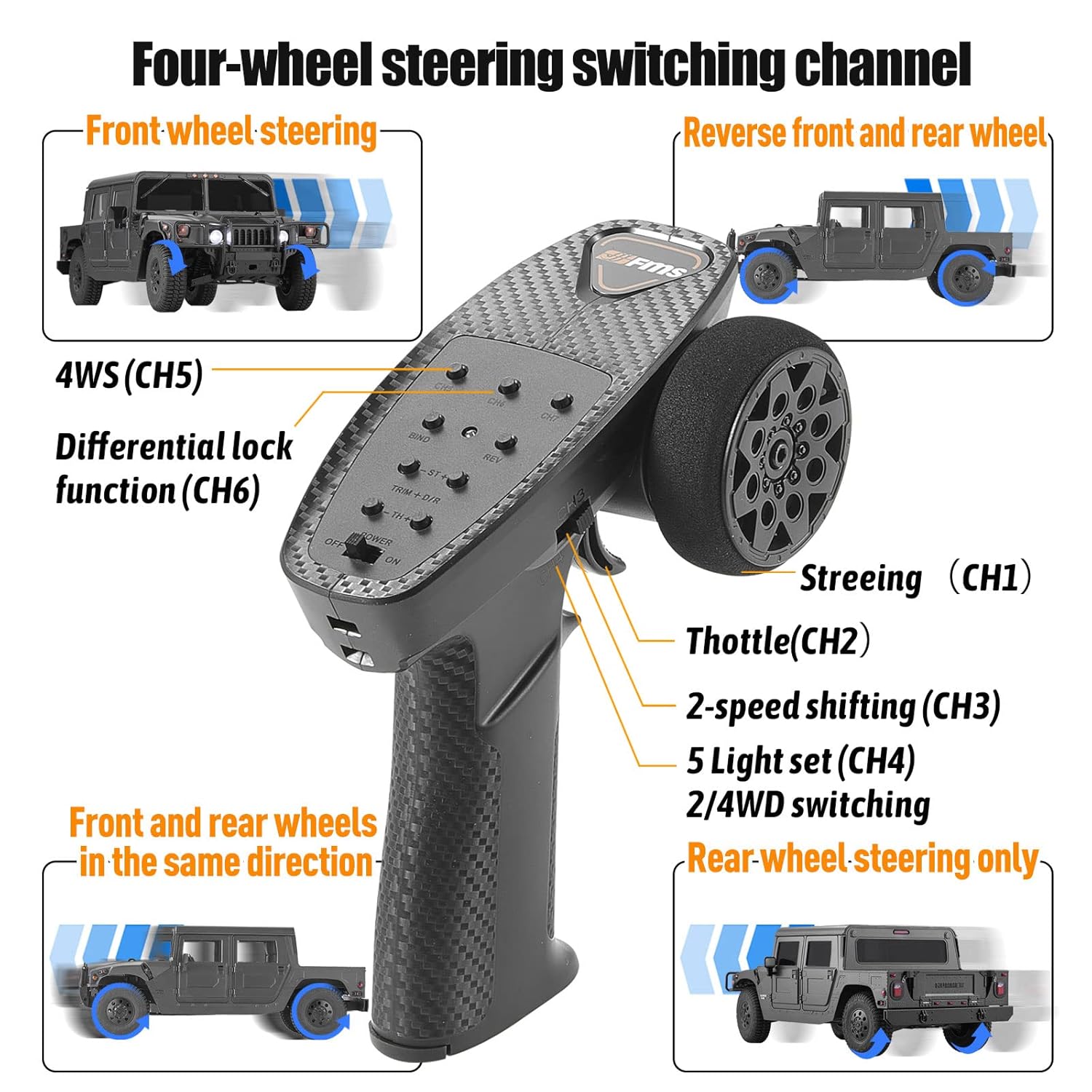 - The HUMMER H1 also has a full metal gear-set and 47 ball-bearings. We have included the rear wheel steering as an additional hidden function, so you now have a total of 4 steering modes! The extra mode, which can reduce the steering radius by 50%, is ideal in confined spaces.