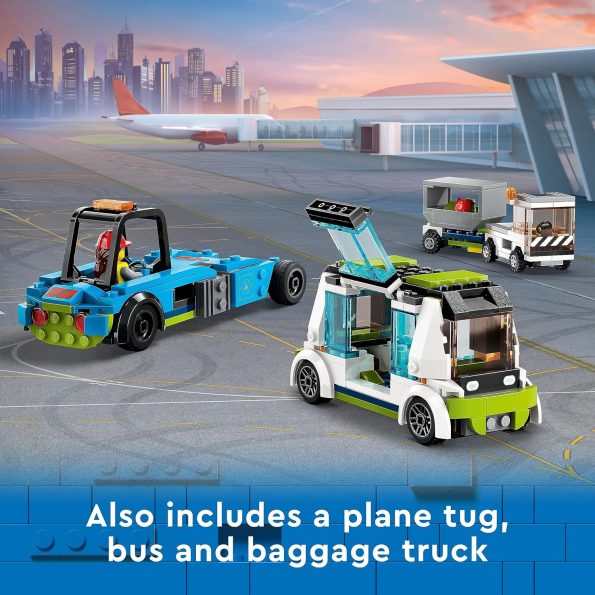 What?s in the box? ? This toy playset has everything kids need to build a Passenger Airplane, airstair, apron bus, pushback tug, catering truck and baggage truck, plus 9 minifigures