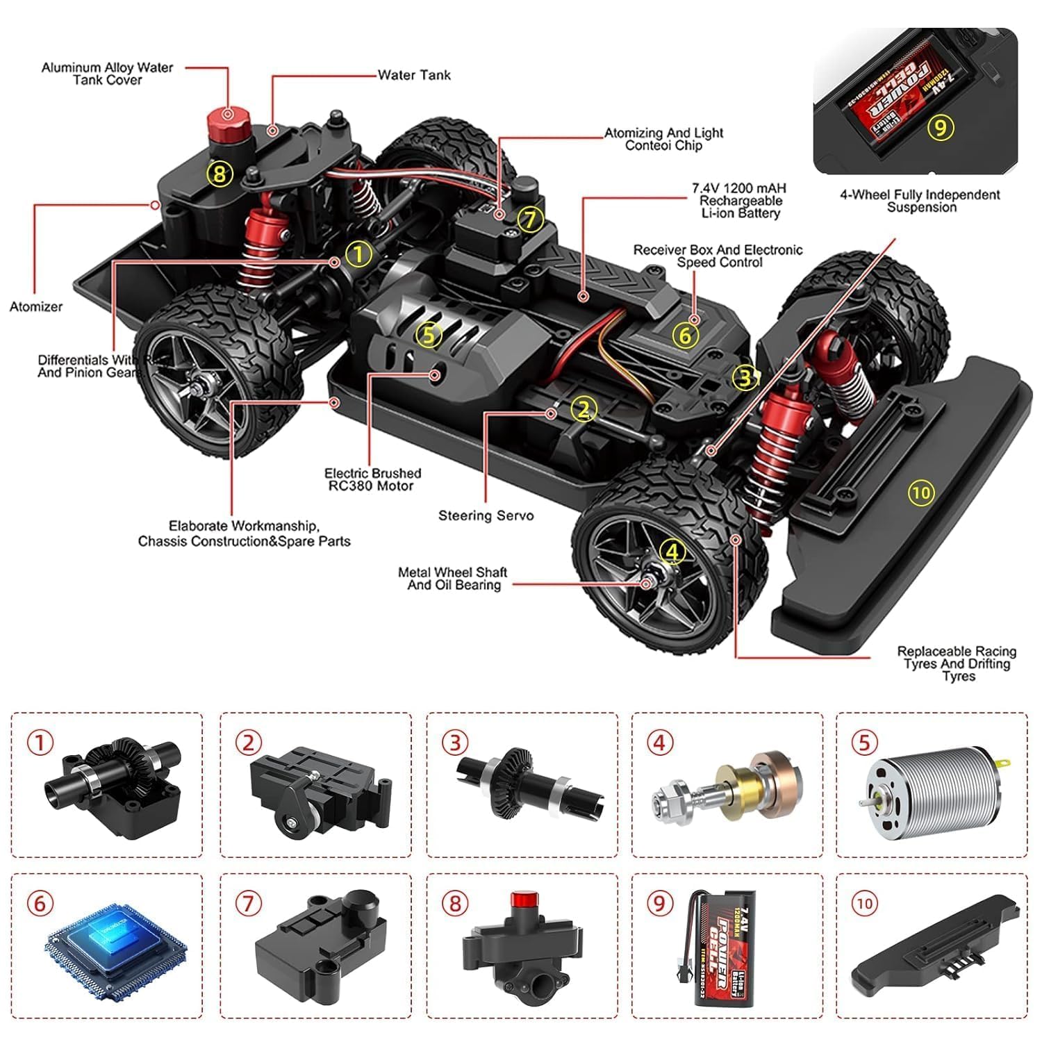 - Playzu brings to you a unique Die-cast Remote Control Car in a grand 1:12 Scale with an amazing Mist Spray function and a realistic Engine Sound effect